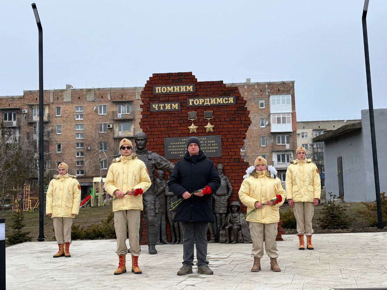 В Волновахе он возложил цветы к памятнику Герою ДНР и Герою России, командиру батальона «Спарта» Владимиру Жоге, который погиб 5 марта 2022 года, обеспечивая эвакуацию мирных жителей города.
